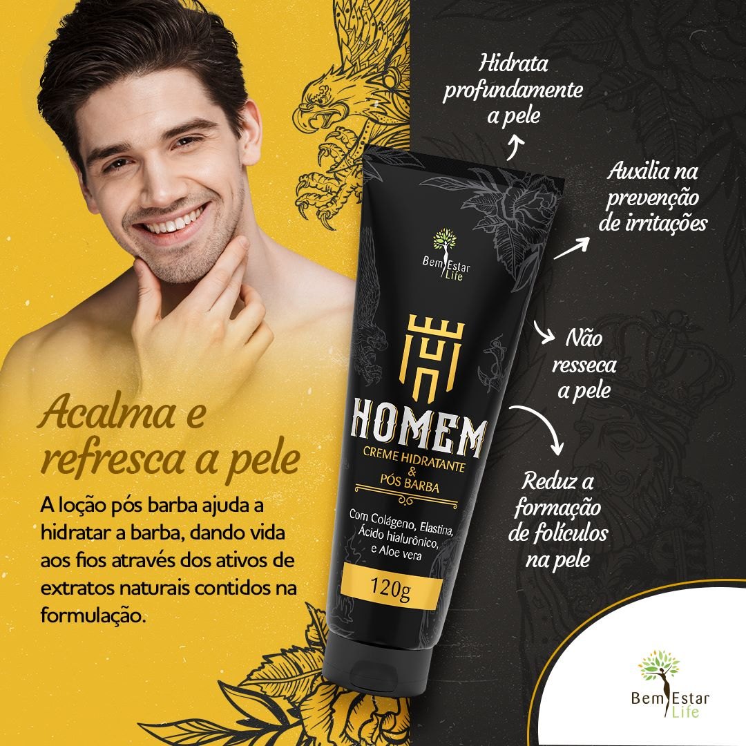 O novo Creme Hidratante & Pós Barba Bem Estar Life®?* com *Ácido hialurônico, Colágeno, Aloe vera e Elastina, possui propriedades tonificante, cicatrizante, anti-inflamatória e hidratante ideal para homens que procuram uma pele mais saudável, hidratada e com maciez.